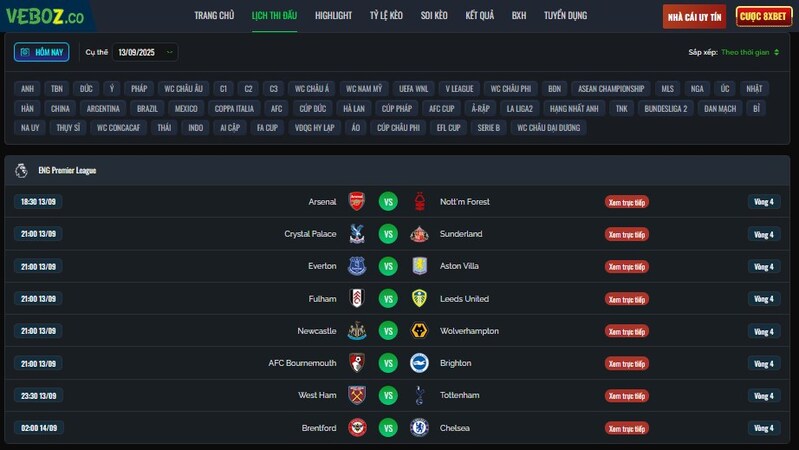 - Đa dạng giải đấu: Không chỉ có Ngoại hạng Anh mà còn có La Liga, Serie A, Bundesliga, Champions League và cả các giải châu Á.